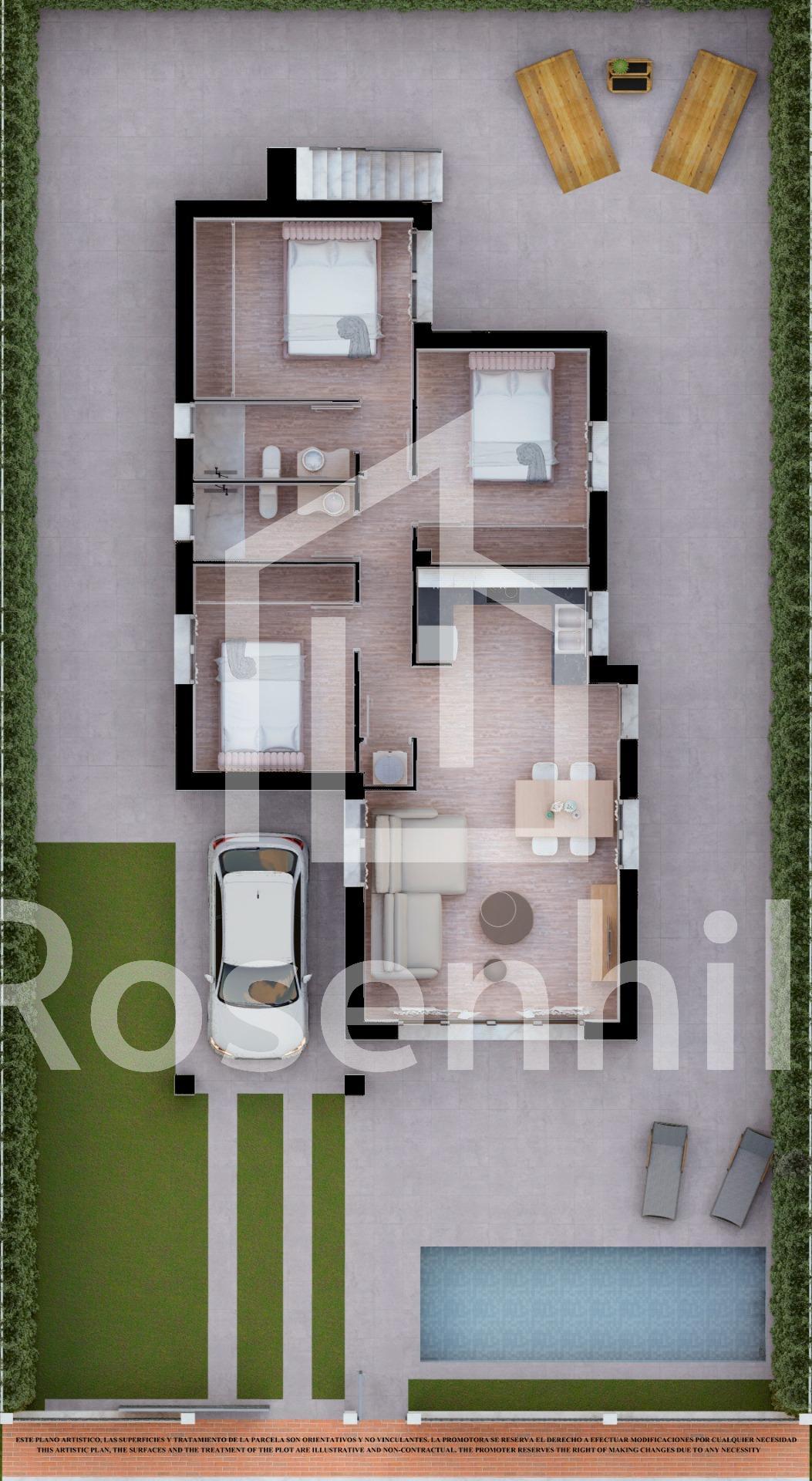 NEW BUILD VILLAS IN LOS ALCAZARES New Build detached villa build on the generous plot of 350m2 in Los Alcazares . Villa with 3 bedrooms and 2 bathrooms, open plan kitchen with the lounge area, fitted wardrobes, solarium, private garden with off road parking space and space for a swimming pool. An options for a private pool at an extra cost. Spacious living room has large sliding doors to a terrace. Ample terraces at the front and rear ensure that owners can sunbathe throughout the day. This villas have modern fitted kitchens with a choice of colours for kitchen units and wall tiles in both kitchens and bathrooms and also floors and terraces. Residential of villas located 1 km from the beach and the town of Los Alcázares, where you can practice various water sports, surrounded by several golf courses. City of Cartagena less than 15 minutes by car and 30 minutes from Murcia Corvera airport.