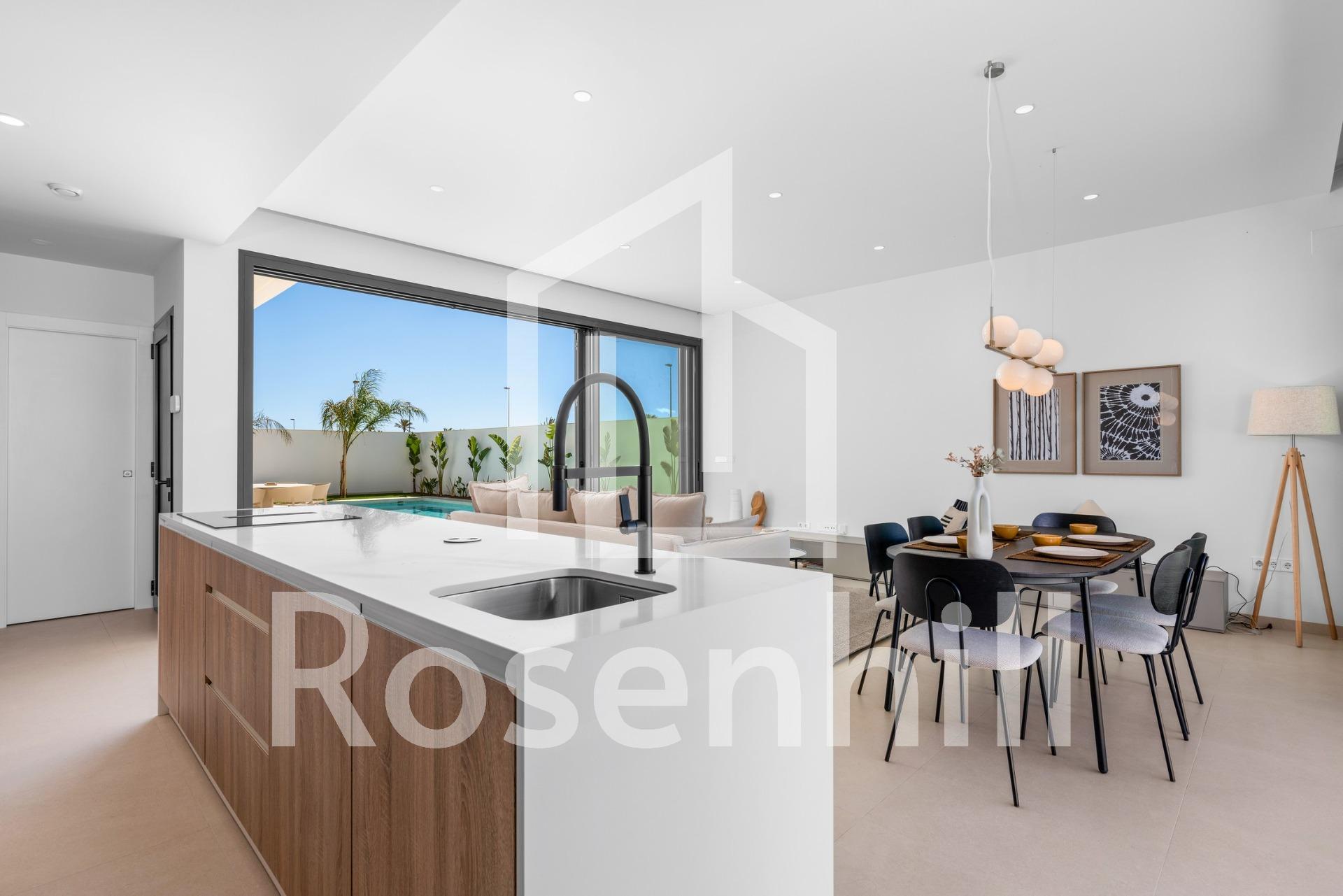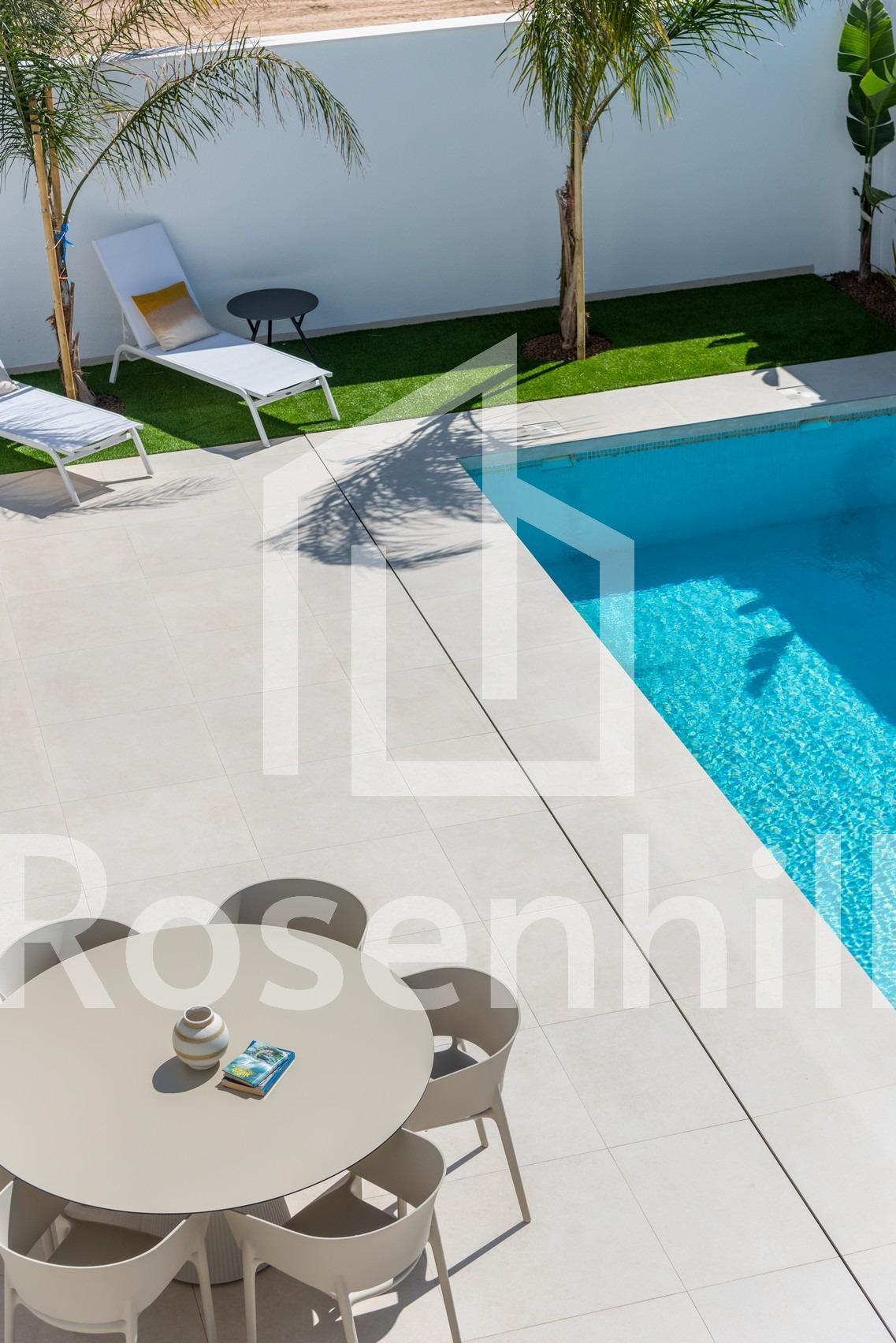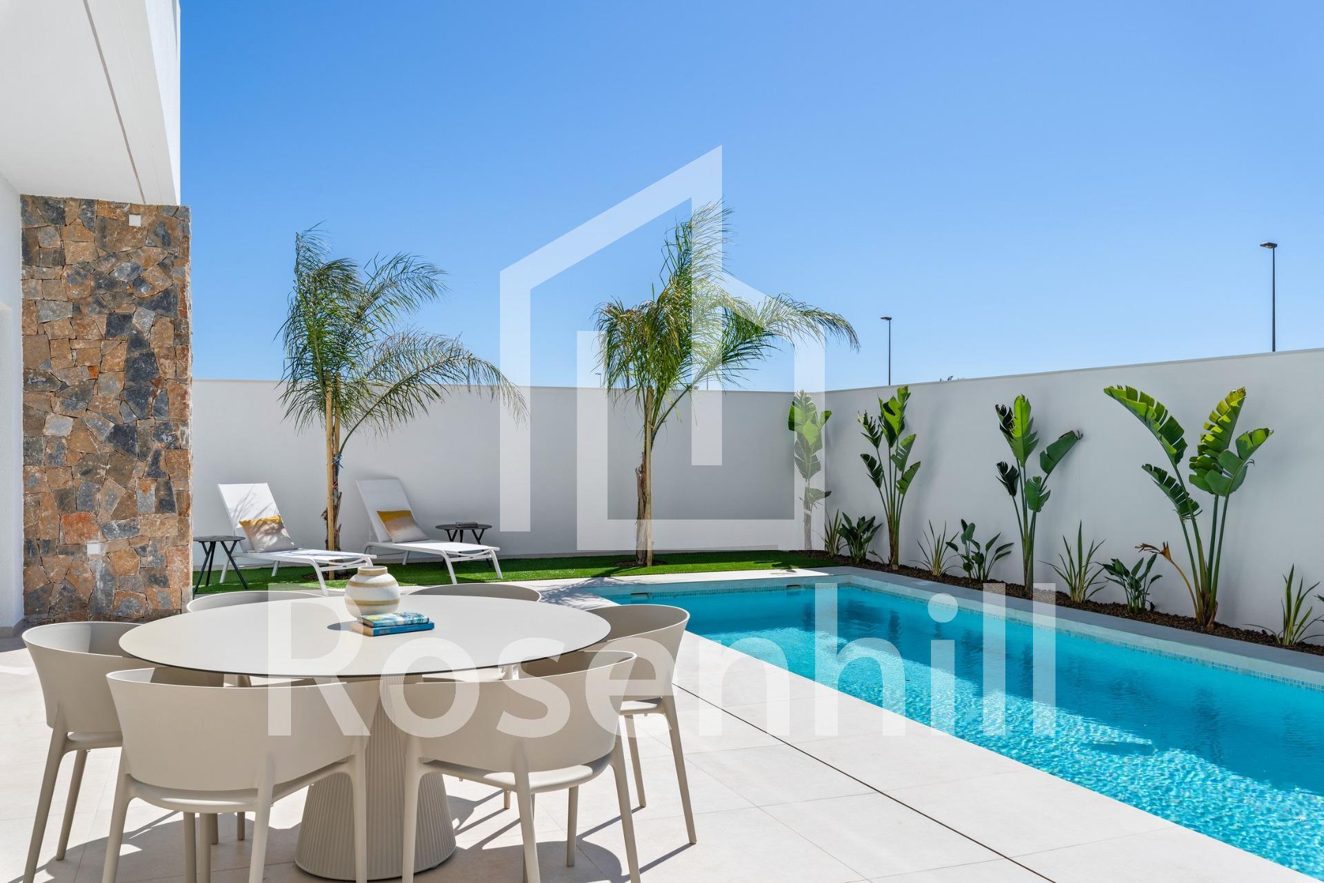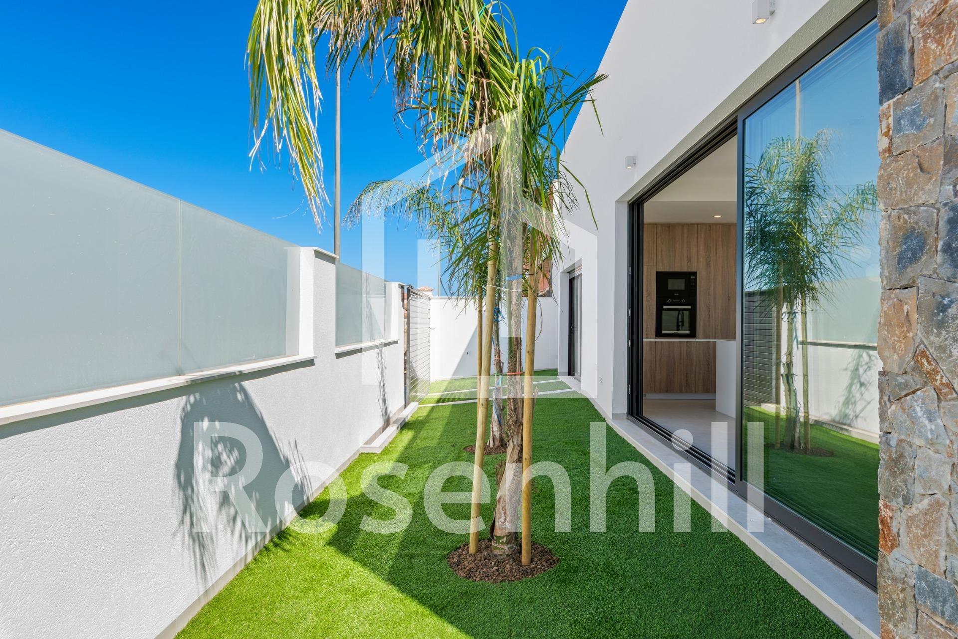 NEW BUILD VILLAS IN SAN JAVIER New build residential development of villas in San Javier, 2.5 km from the beach. Villas built on one floor and consisting of 3 bedrooms, 2 bathrooms and 1 toilet, open-plan kitchen, living room with open views to the terrace, private garden with swimming pool and solarium. Fully fitted kitchen in gloss white or wood including induction hob with integrated extractor, oven, microwave, washing machine, integrated fridge and integrated dishwasher. Complete ducted air conditioning installation. The pool has pre-installation for a heat pump. San Javier is close to all amenities with easy access to the beach, water sports, shops and transport links. Here you can enjoy all the facilities that San Javier has to offer, such as local shops, bars and restaurants, as well as being close to shopping centres, Murcia airport and all the beautiful places along the Mar Menor. Corvera/Murcia airport is 30 minutes away and Alicante airport is 45 minutes away.