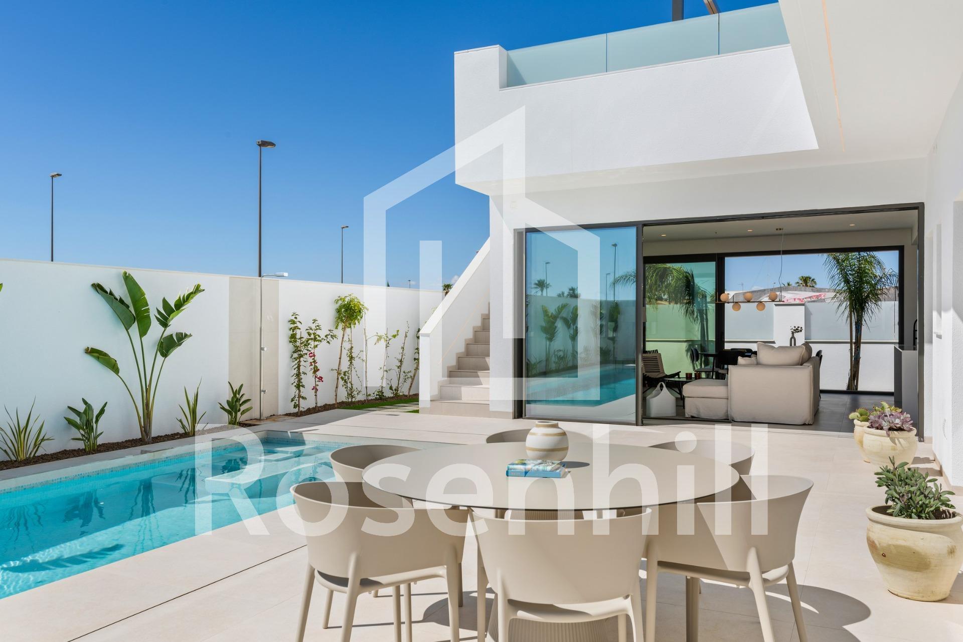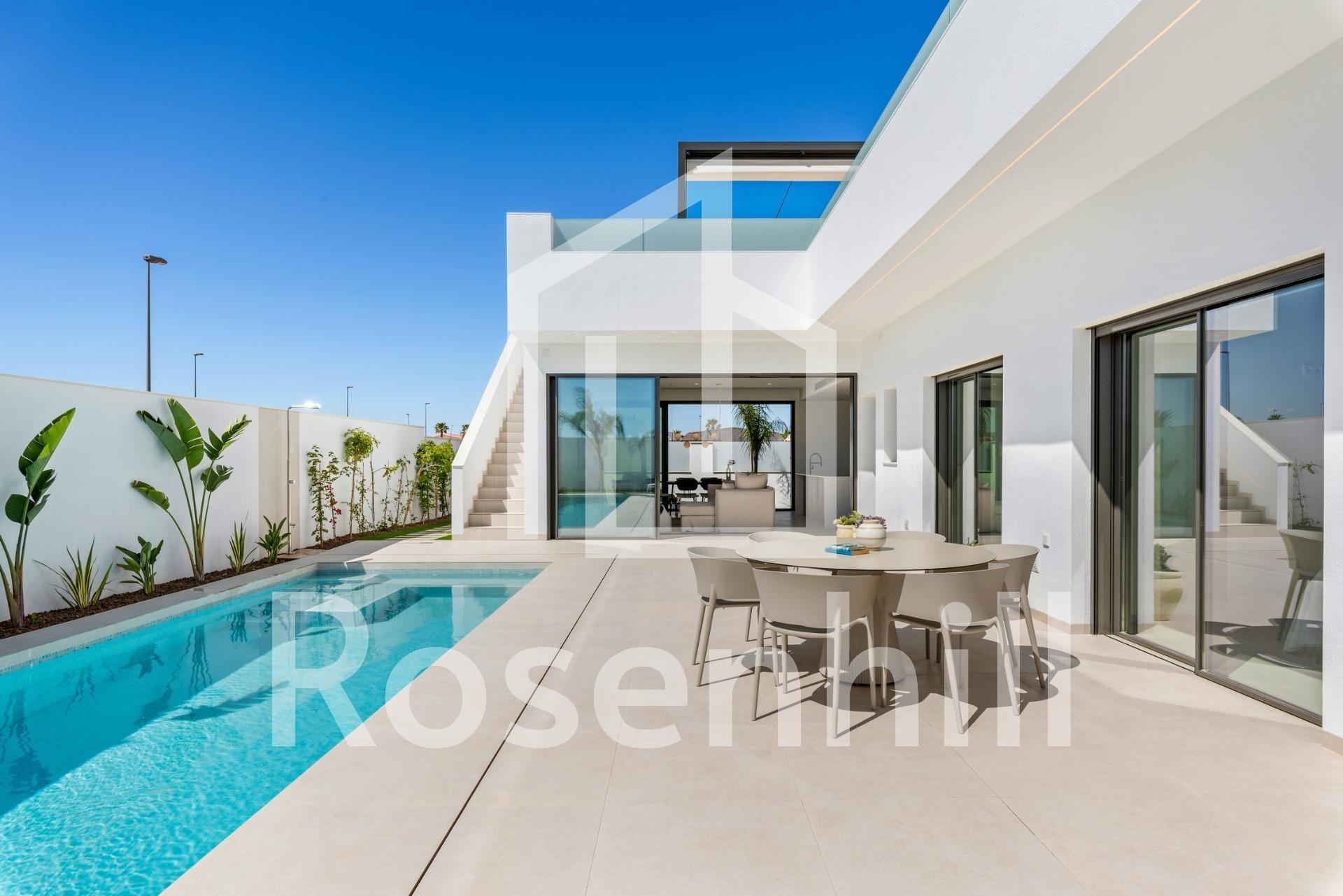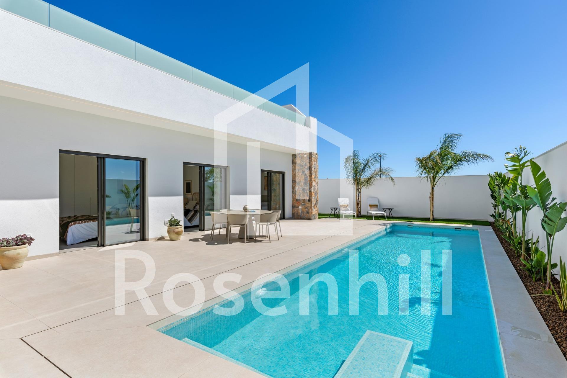 NEW BUILD VILLAS IN SAN JAVIER New build residential development of villas in San Javier, 2.5 km from the beach. Villas built on one floor and consisting of 3 bedrooms, 2 bathrooms and 1 toilet, open-plan kitchen, living room with open views to the terrace, private garden with swimming pool and solarium. Fully fitted kitchen in gloss white or wood including induction hob with integrated extractor, oven, microwave, washing machine, integrated fridge and integrated dishwasher. Complete ducted air conditioning installation. The pool has pre-installation for a heat pump. San Javier is close to all amenities with easy access to the beach, water sports, shops and transport links. Here you can enjoy all the facilities that San Javier has to offer, such as local shops, bars and restaurants, as well as being close to shopping centres, Murcia airport and all the beautiful places along the Mar Menor. Corvera/Murcia airport is 30 minutes away and Alicante airport is 45 minutes away.