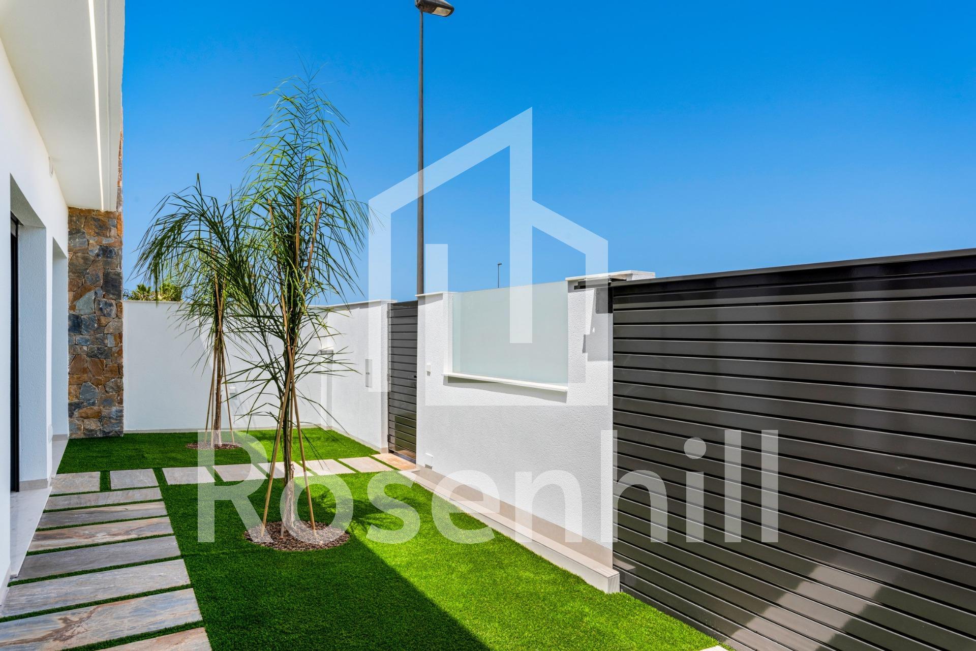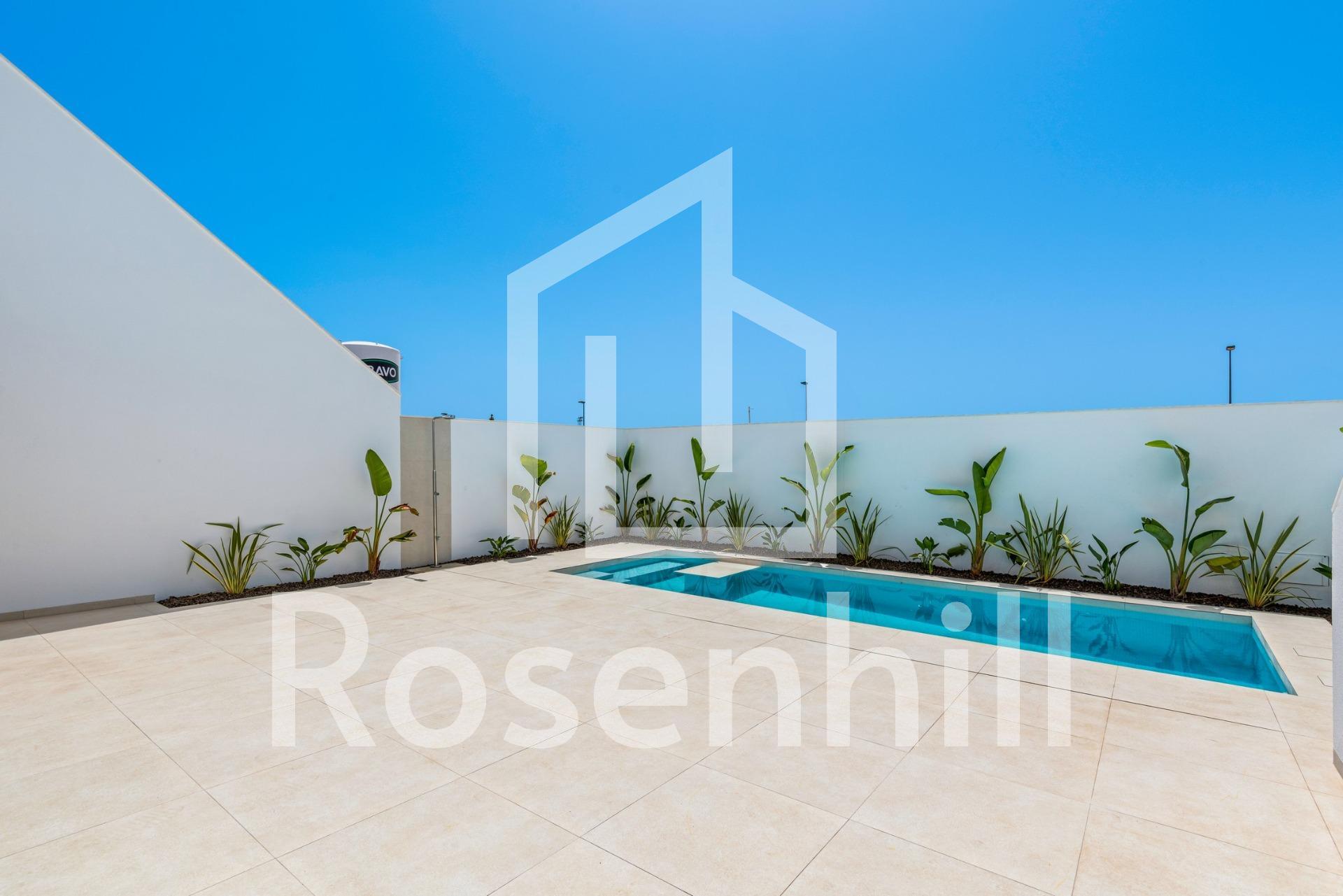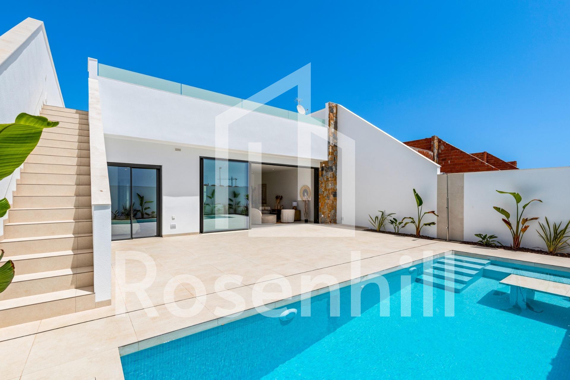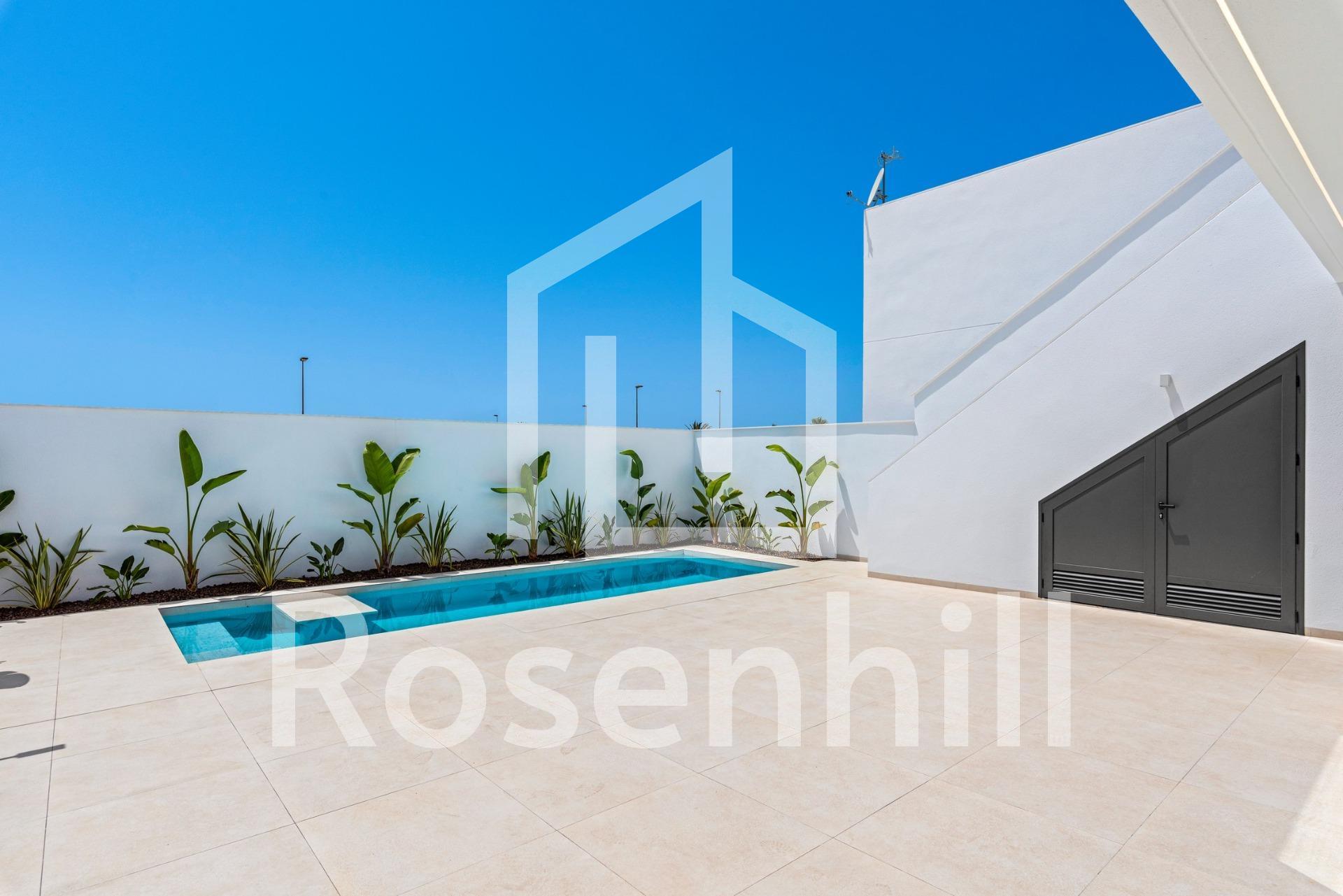 New Build Villas Near Serena Golf in Los Alcazares Modern Villas in a Prime Coastal and Golf Location This exclusive new build residential project offers modern villas located in Los Alcazares, just a short distance from the prestigious Serena Golf and only 1.2 km from the sandy beaches of the Mar Menor. Set in one of the most attractive areas of the Region of Murcia, these homes combine contemporary design, comfort and an excellent location close to the sea, golf and all daily services. Los Alcazares is a well established coastal town known for its relaxed lifestyle, long promenade, water sports and mild climate throughout the year. Single Level Design with Private Outdoor Spaces The development features stylish villas with 3 bedrooms and 2 bathrooms, available in two different built sizes of approximately 106 sqm and 130 sqm. The larger model also includes an additional guest toilet. All villas are designed on a single floor, offering practical and comfortable living. The open plan kitchen, dining and living area connects directly to a terrace and private garden with swimming pool, creating an ideal space for indoor and outdoor living. Each property also includes a private solarium and on plot parking. High Quality Finishes and Modern Equipment These villas are built with high quality materials and equipped with modern features. The fully fitted kitchens are available in white gloss or wood finish and include quartz worktops, stainless steel sink, induction hob with integrated extractor, oven, microwave, washing machine, integrated fridge and dishwasher. Bathrooms are fitted with furniture, mirrors, lighting and electric towel heaters. Additional features include electric blinds in bedrooms, LED lighting throughout the property and a complete ducted air conditioning system by Fujitsu. Private Pool and Energy Efficient Comfort Each villa includes a private swimming pool finished with blue ceramic tiles, integrated steps and white LED lighting. The pool is prepared with pre installation for a heat pump. The combination of efficient climate control, modern construction and thoughtful design ensures comfort all year round. Excellent Connectivity and Key Distances The villas are within walking distance of the town centre of Los Alcazares and very close to Serena Golf. The beach is approximately 1.2 km away. Cartagena city is around 20 km away, offering a rich cultural and gastronomic scene. Murcia Corvera International Airport is about 22 km away, and Alicante Airport is approximately 90 km. Several golf courses and marinas are also nearby, making this location ideal for both permanent living and holidays. Your Ideal Home by the Sea and Golf If you are looking for a modern new build villa near the beach and golf in Los Alcazares, contact us today for more information or to arrange a private viewing.