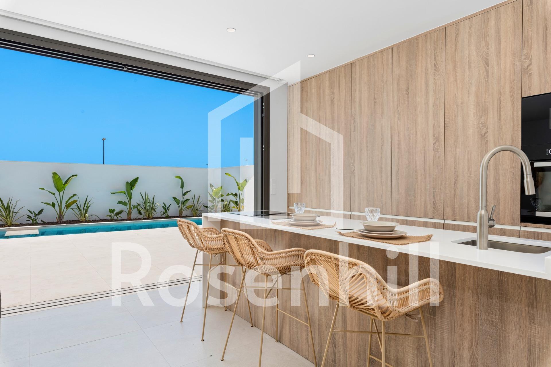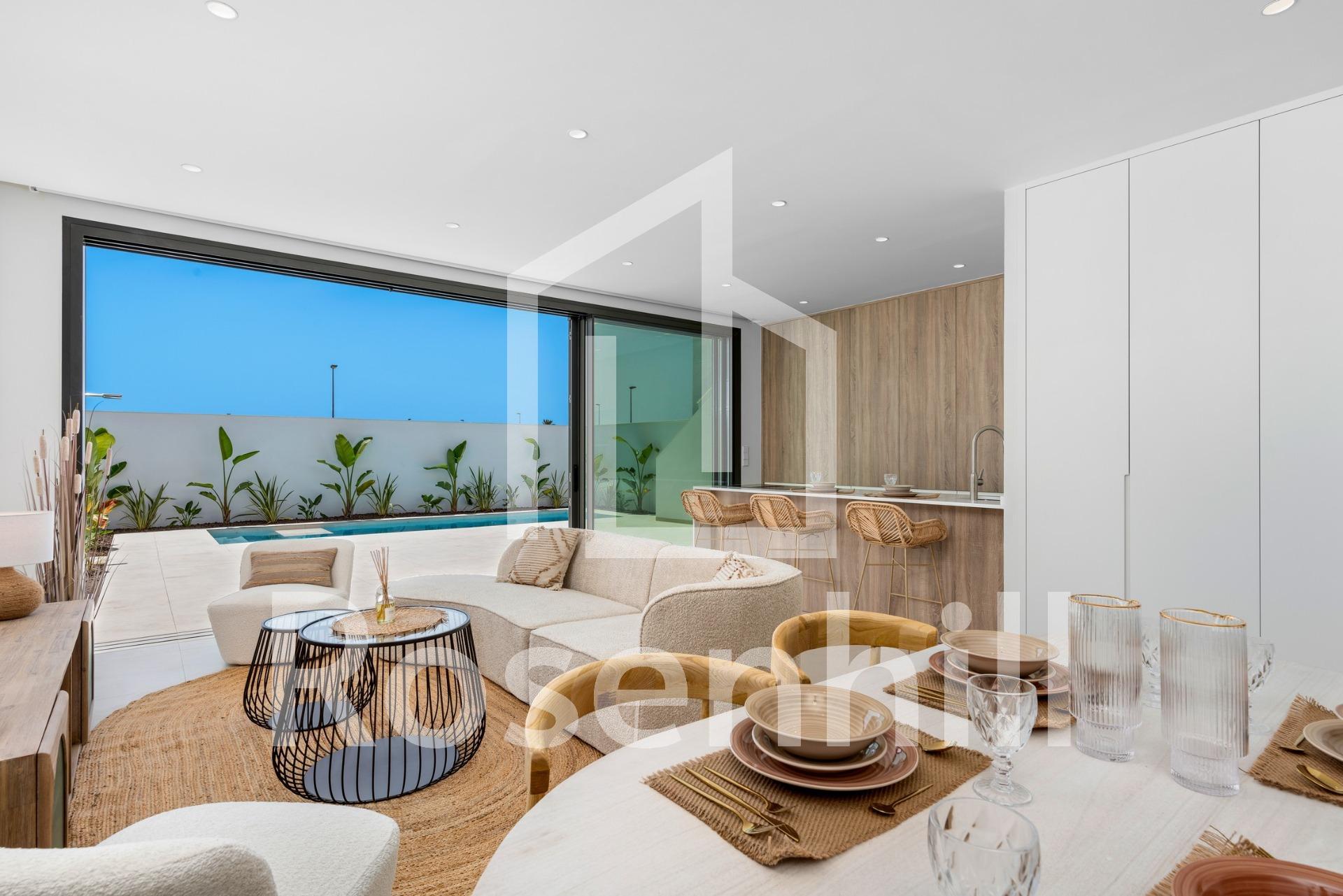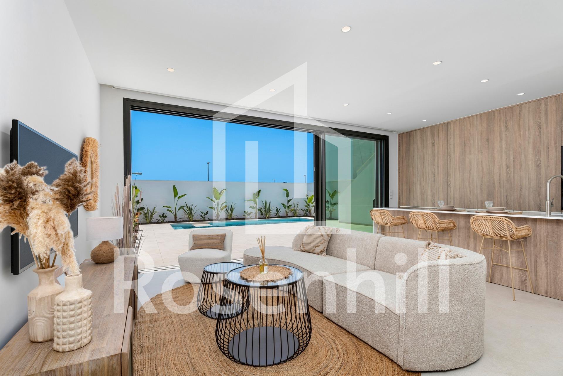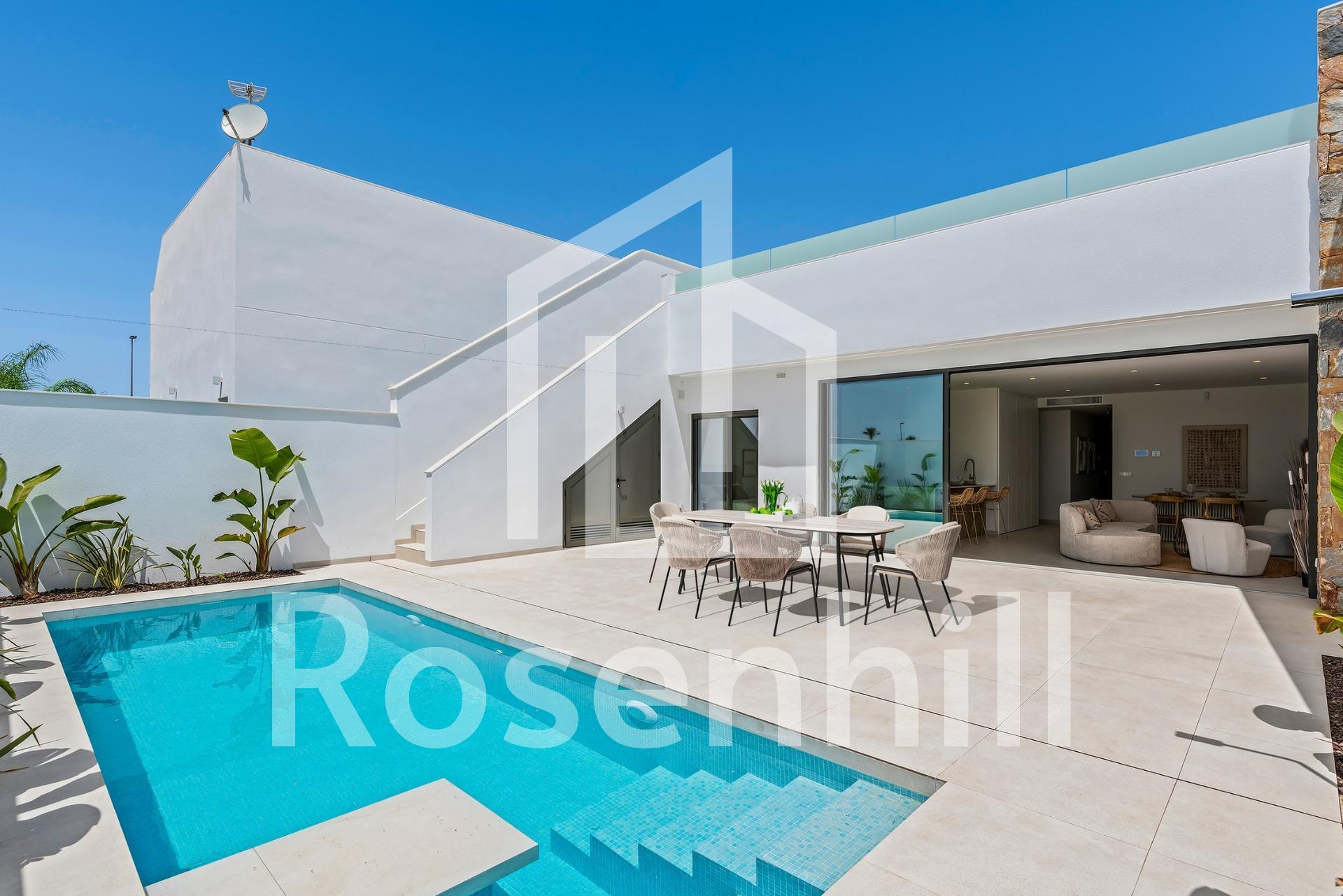 New Build Villas Near Serena Golf in Los Alcazares Modern Villas in a Prime Coastal and Golf Location This exclusive new build residential project offers modern villas located in Los Alcazares, just a short distance from the prestigious Serena Golf and only 1.2 km from the sandy beaches of the Mar Menor. Set in one of the most attractive areas of the Region of Murcia, these homes combine contemporary design, comfort and an excellent location close to the sea, golf and all daily services. Los Alcazares is a well established coastal town known for its relaxed lifestyle, long promenade, water sports and mild climate throughout the year. Single Level Design with Private Outdoor Spaces The development features stylish villas with 3 bedrooms and 2 bathrooms, available in two different built sizes of approximately 106 sqm and 130 sqm. The larger model also includes an additional guest toilet. All villas are designed on a single floor, offering practical and comfortable living. The open plan kitchen, dining and living area connects directly to a terrace and private garden with swimming pool, creating an ideal space for indoor and outdoor living. Each property also includes a private solarium and on plot parking. High Quality Finishes and Modern Equipment These villas are built with high quality materials and equipped with modern features. The fully fitted kitchens are available in white gloss or wood finish and include quartz worktops, stainless steel sink, induction hob with integrated extractor, oven, microwave, washing machine, integrated fridge and dishwasher. Bathrooms are fitted with furniture, mirrors, lighting and electric towel heaters. Additional features include electric blinds in bedrooms, LED lighting throughout the property and a complete ducted air conditioning system by Fujitsu. Private Pool and Energy Efficient Comfort Each villa includes a private swimming pool finished with blue ceramic tiles, integrated steps and white LED lighting. The pool is prepared with pre installation for a heat pump. The combination of efficient climate control, modern construction and thoughtful design ensures comfort all year round. Excellent Connectivity and Key Distances The villas are within walking distance of the town centre of Los Alcazares and very close to Serena Golf. The beach is approximately 1.2 km away. Cartagena city is around 20 km away, offering a rich cultural and gastronomic scene. Murcia Corvera International Airport is about 22 km away, and Alicante Airport is approximately 90 km. Several golf courses and marinas are also nearby, making this location ideal for both permanent living and holidays. Your Ideal Home by the Sea and Golf If you are looking for a modern new build villa near the beach and golf in Los Alcazares, contact us today for more information or to arrange a private viewing.