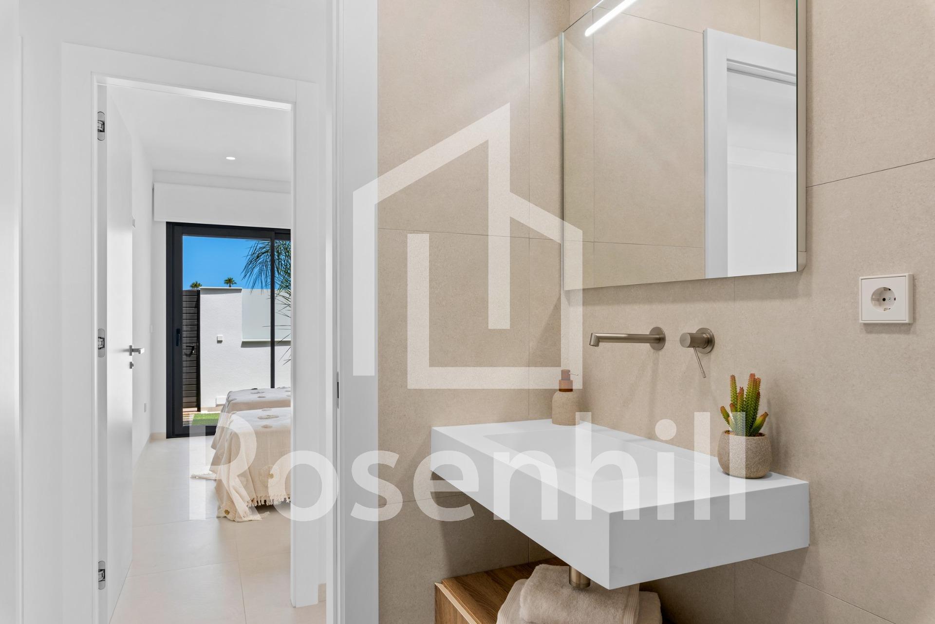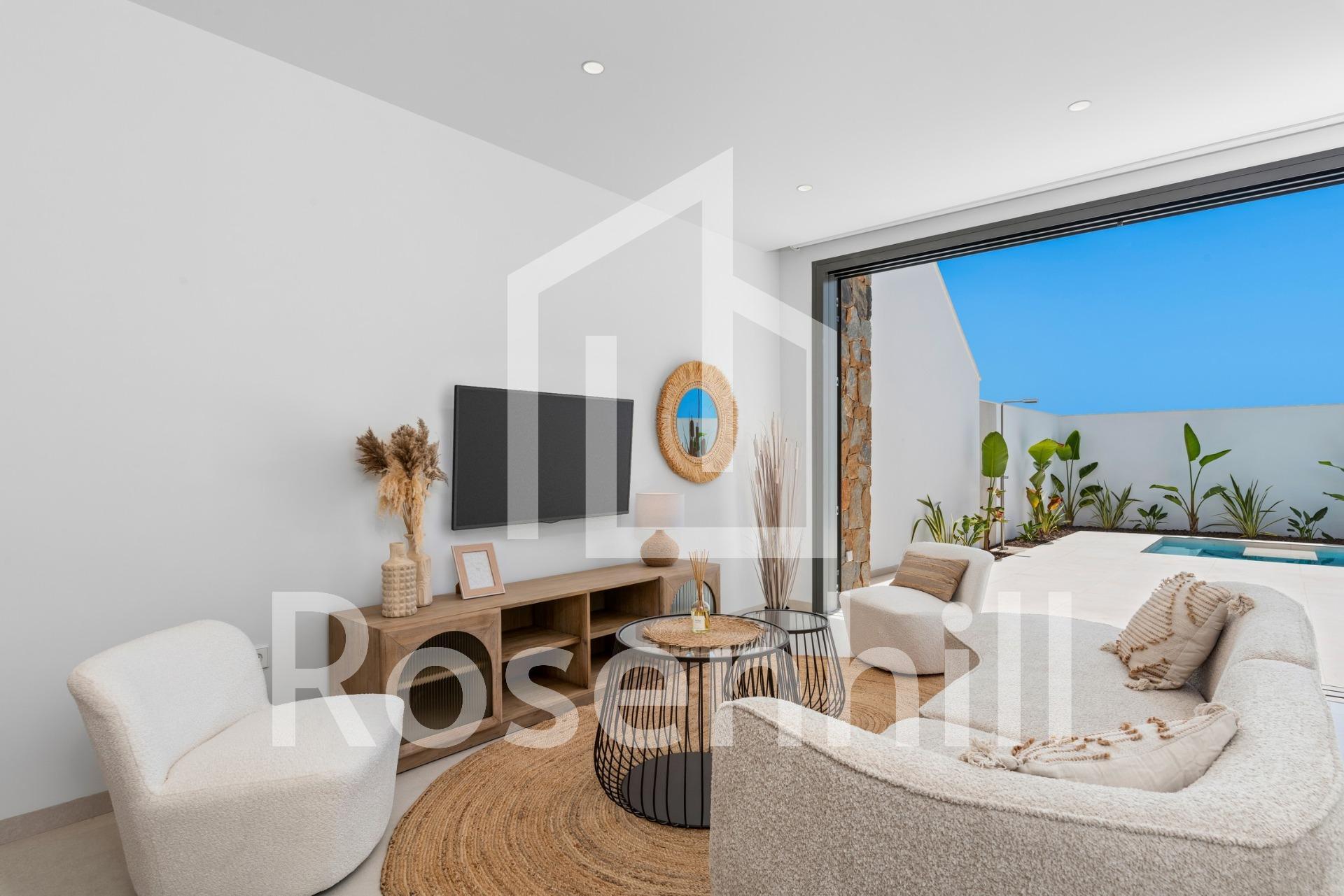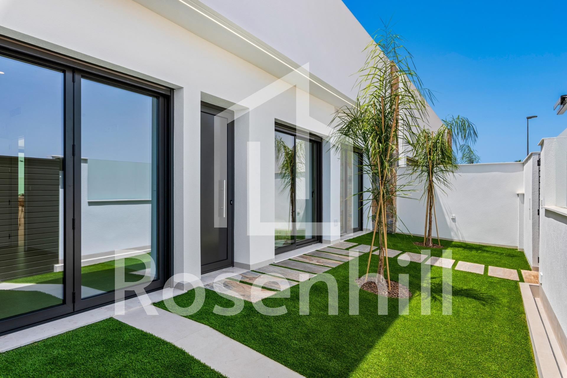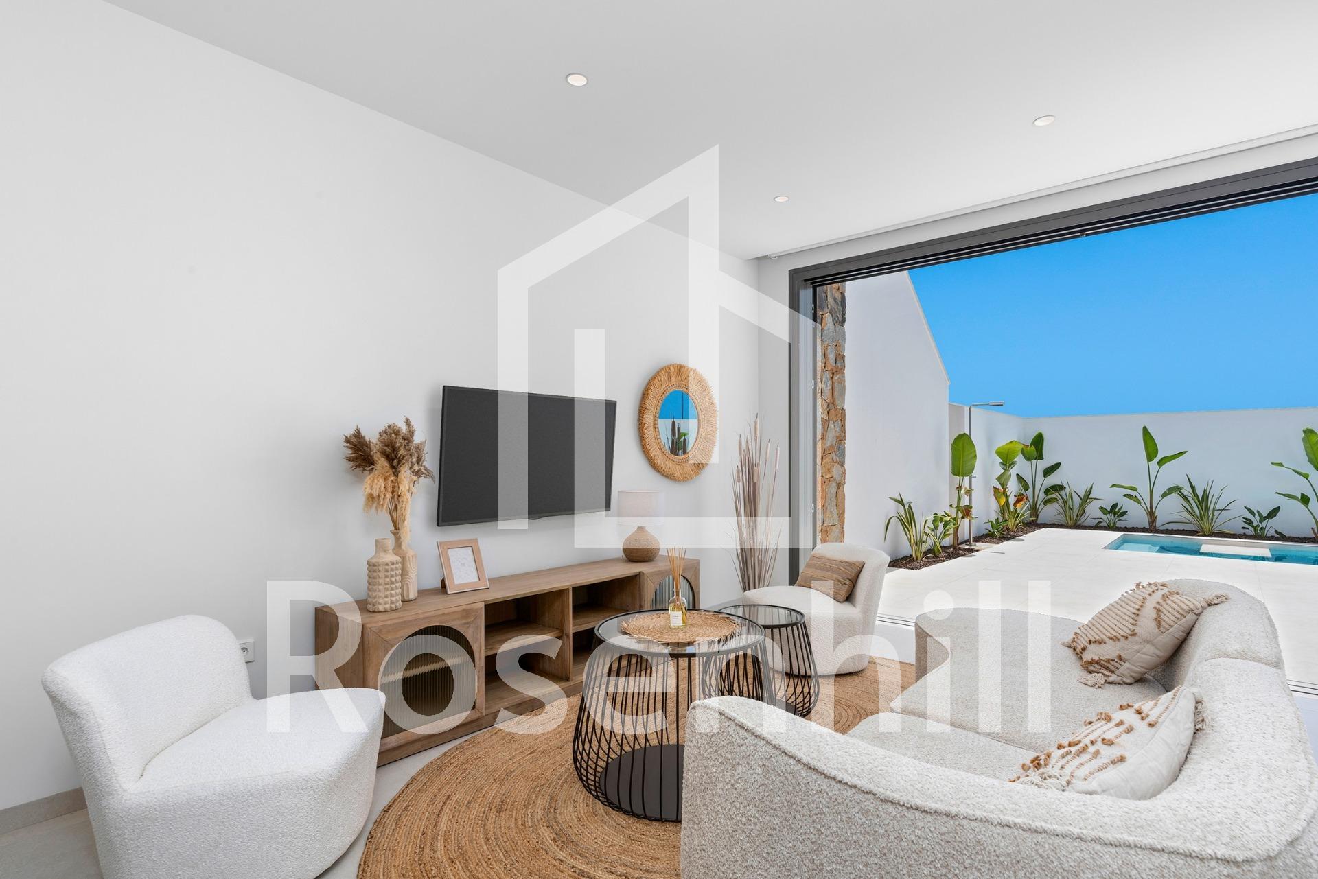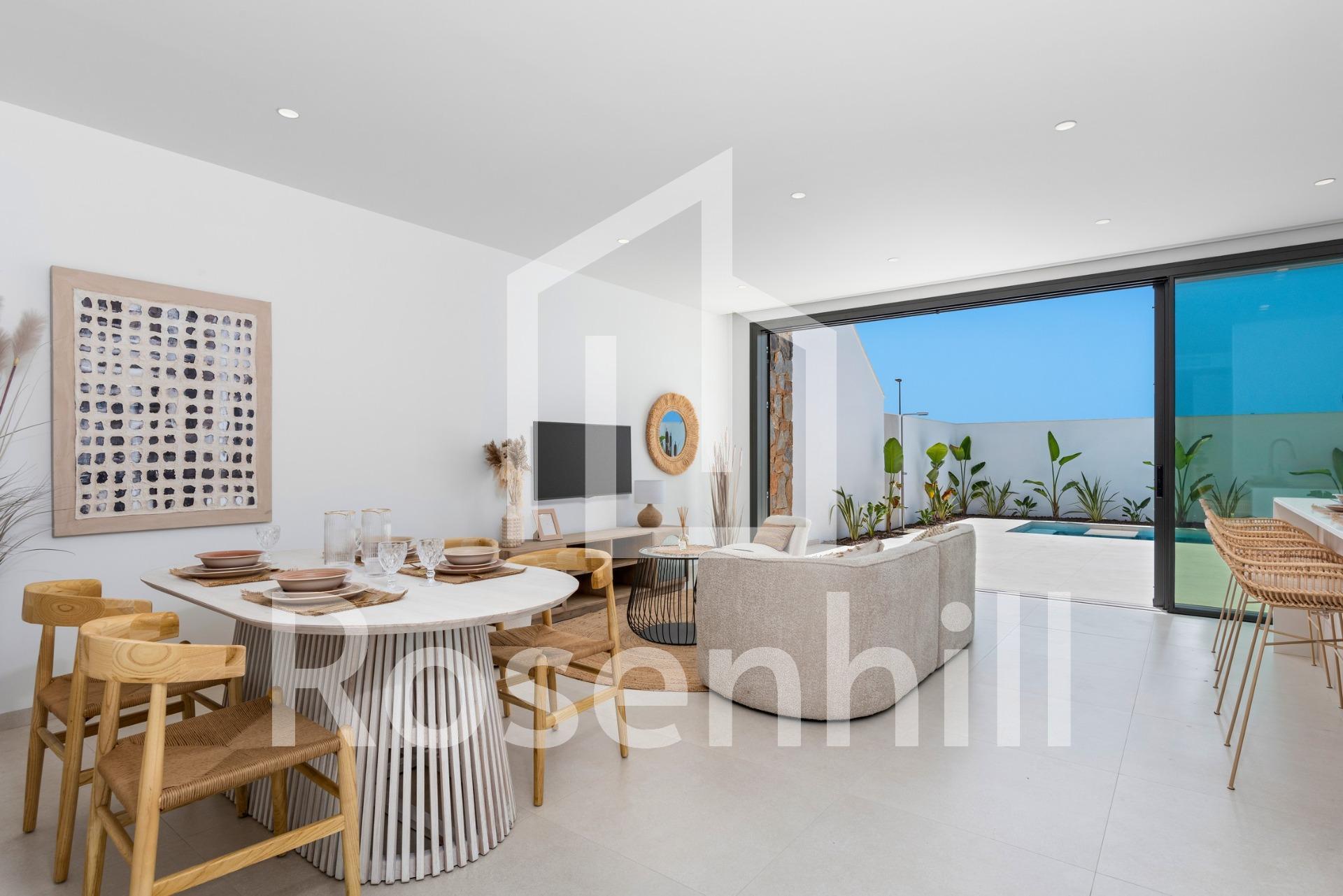 New Build Villas Near Serena Golf in Los Alcazares Modern Villas in a Prime Coastal and Golf Location This exclusive new build residential project offers modern villas located in Los Alcazares, just a short distance from the prestigious Serena Golf and only 1.2 km from the sandy beaches of the Mar Menor. Set in one of the most attractive areas of the Region of Murcia, these homes combine contemporary design, comfort and an excellent location close to the sea, golf and all daily services. Los Alcazares is a well established coastal town known for its relaxed lifestyle, long promenade, water sports and mild climate throughout the year. Single Level Design with Private Outdoor Spaces The development features stylish villas with 3 bedrooms and 2 bathrooms, available in two different built sizes of approximately 106 sqm and 130 sqm. The larger model also includes an additional guest toilet. All villas are designed on a single floor, offering practical and comfortable living. The open plan kitchen, dining and living area connects directly to a terrace and private garden with swimming pool, creating an ideal space for indoor and outdoor living. Each property also includes a private solarium and on plot parking. High Quality Finishes and Modern Equipment These villas are built with high quality materials and equipped with modern features. The fully fitted kitchens are available in white gloss or wood finish and include quartz worktops, stainless steel sink, induction hob with integrated extractor, oven, microwave, washing machine, integrated fridge and dishwasher. Bathrooms are fitted with furniture, mirrors, lighting and electric towel heaters. Additional features include electric blinds in bedrooms, LED lighting throughout the property and a complete ducted air conditioning system by Fujitsu. Private Pool and Energy Efficient Comfort Each villa includes a private swimming pool finished with blue ceramic tiles, integrated steps and white LED lighting. The pool is prepared with pre installation for a heat pump. The combination of efficient climate control, modern construction and thoughtful design ensures comfort all year round. Excellent Connectivity and Key Distances The villas are within walking distance of the town centre of Los Alcazares and very close to Serena Golf. The beach is approximately 1.2 km away. Cartagena city is around 20 km away, offering a rich cultural and gastronomic scene. Murcia Corvera International Airport is about 22 km away, and Alicante Airport is approximately 90 km. Several golf courses and marinas are also nearby, making this location ideal for both permanent living and holidays. Your Ideal Home by the Sea and Golf If you are looking for a modern new build villa near the beach and golf in Los Alcazares, contact us today for more information or to arrange a private viewing.