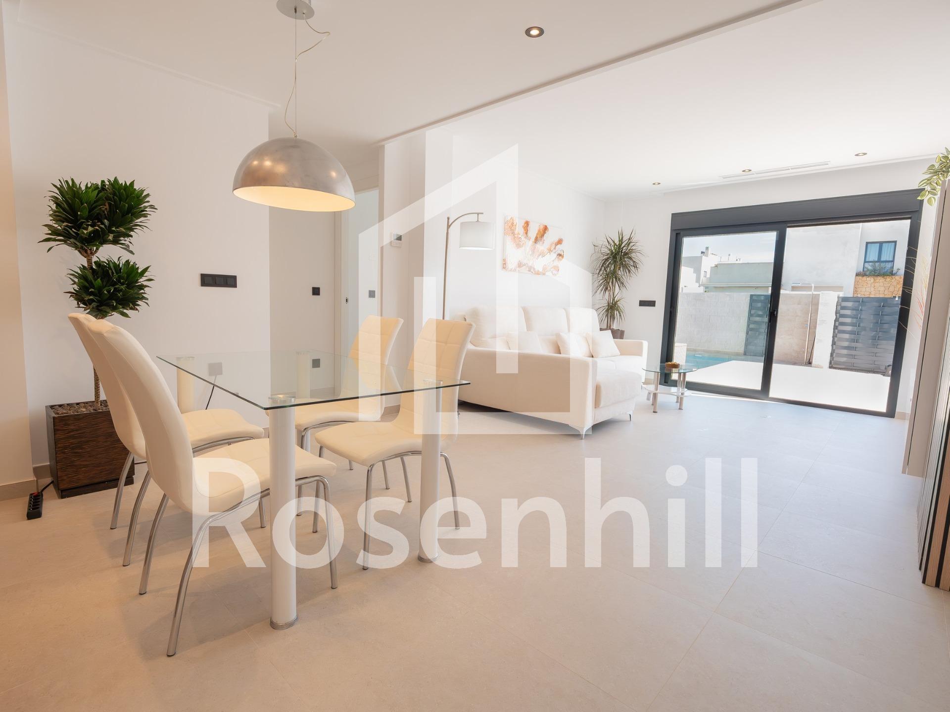 New Build Villas with Private Pool in Oasis de la Marina, Costa Blanca Modern homes in a quiet location near the beach Discover this exclusive development of 15 detached and semi-detached new-build villas, located in the Oasis de La Marina residential area in the municipality of San Fulgencio. These elegant, contemporary-designed homes are built on one floor and are just 4.5 km from the spectacular beaches of the Costa Blanca. An ideal setting for both permanent living and holiday getaways, in a quiet but well-connected area. Functional layout and design for maximum comfort Each villa has a practical and bright layout, designed for enjoying the Mediterranean lifestyle: 3 bedrooms with fitted wardrobes 2 full bathrooms with furniture and glass screens Fully equipped open-plan kitchen with extractor hood and osmosis system Spacious living-dining room with direct access to the garden Private solarium Private garden with swimming pool and solarium area Parking space on the plot Complete equipment and energy efficiency These villas are designed with high-quality materials and energy-efficient solutions: Hot and cold air conditioning system Installation of photovoltaic solar panels Interior and exterior LED lighting Electric aluminium blinds Private pool in each property Private parking within the plot Natural surroundings and nearby amenities Oasis de La Marina is a quiet residential area surrounded by nature, between the towns of San Fulgencio, La Marina and Guardamar del Segura. The location offers proximity to all the necessary amenities for everyday life, as well as leisure and sports options. Nearby points of interest: Nearest beach: 4.5 km La Marquesa golf course: 6 km Habaneras shopping centre (Torrevieja): 15 km Alicante airport: 29 km Murcia airport: 66 km Quick access to the N-332 national road Enjoy the Mediterranean lifestyle in a privileged setting These villas represent an excellent opportunity for those seeking tranquillity, privacy and proximity to the sea. Contact us today for more information or to arrange a viewing of these exclusive new-build properties in San Fulgencio.