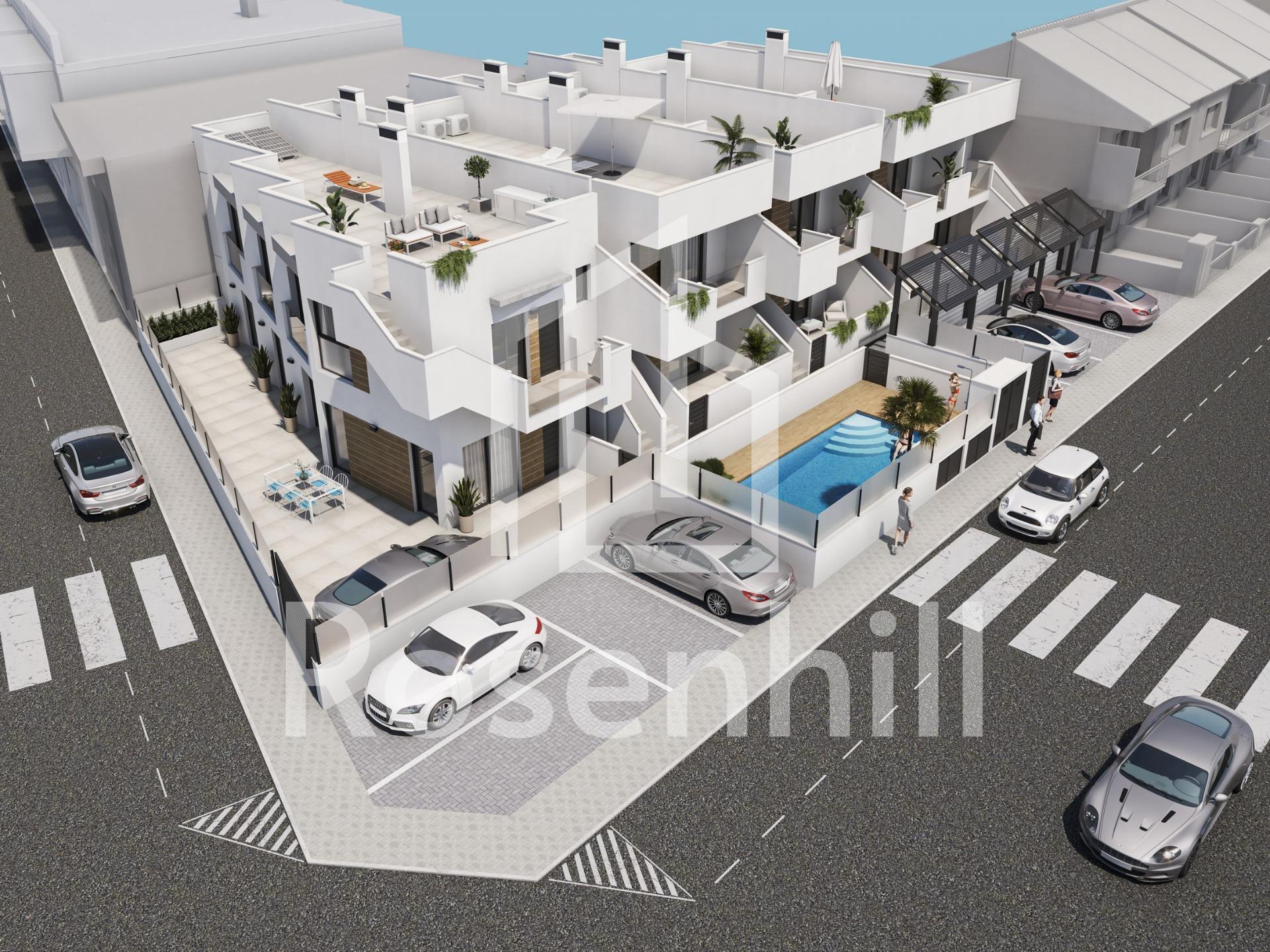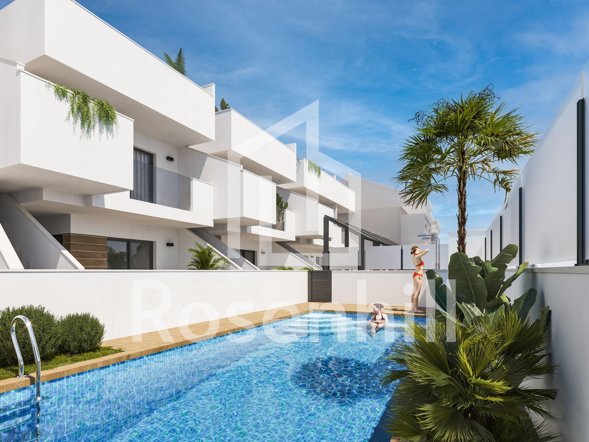 New Bungalows in San Pedro del Pinatar – Modernity and Comfort Just Minutes from the Sea Mediterranean Living in a Prime Location This new development of bungalows is located in San Pedro del Pinatar, one of the most attractive destinations on the Costa Cálida, Murcia. Surrounded by all amenities, sports facilities and several golf courses, this complex is located just 5 minutes from the beaches of the Mediterranean Sea and the Mar Menor, two of the most popular coastal enclaves in the south-east of Spain. Exclusive Residential Development with Style and Functionality The complex consists of 10 newly built bungalows, with 1 bedroom and 1 bathroom, ideal for those looking for an affordable option, and also 3 bedroom and 2 bathroom options, designed for families or those who want more space. Each property includes: Private parking space Fully equipped kitchen with appliances included Modern bathrooms with vanity unit, lighting and glass screen Pre-installation for ducted air conditioning Private solarium on the upper floor properties, with summer kitchen Communal swimming pool with relaxation area and solarium Modern, High-Quality Finishes Designed with a focus on comfort and efficiency, the bungalows feature top-of-the-range materials and finishes: Dark grey lacquered aluminium exterior carpentry Motorised blinds and double glazing with air chamber LED interior and exterior lighting Security door at the entrance Water point on the terrace and solarium Key distances: Dos Mares Shopping Centre: 3 km Mar Menor beaches: 3.5 km Lo Romero Golf Course: 11 km Murcia-Corvera Airport: 39 km Alicante Airport: 78 km San Pedro Marina: 4 km San Pedro del Pinatar – Quality of life all year round This town is famous for its natural mud baths, its peaceful atmosphere and its modern sports and nautical facilities. The mild climate throughout the year and its excellent transport links make it an ideal place to live or holiday. The Lo Pagán area offers a vibrant social life with restaurants, shops and entertainment for all ages. Discover your new home on the Costa Cálida These bungalows represent an excellent investment opportunity or a perfect Mediterranean getaway. Contact us today and schedule your visit to discover your future home in San Pedro del Pinatar.