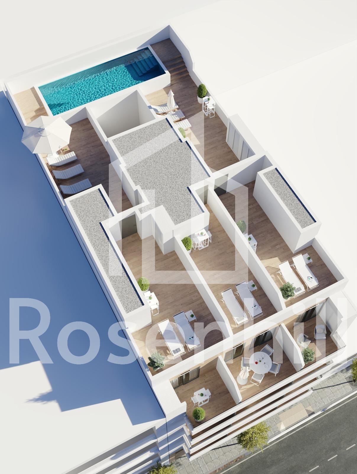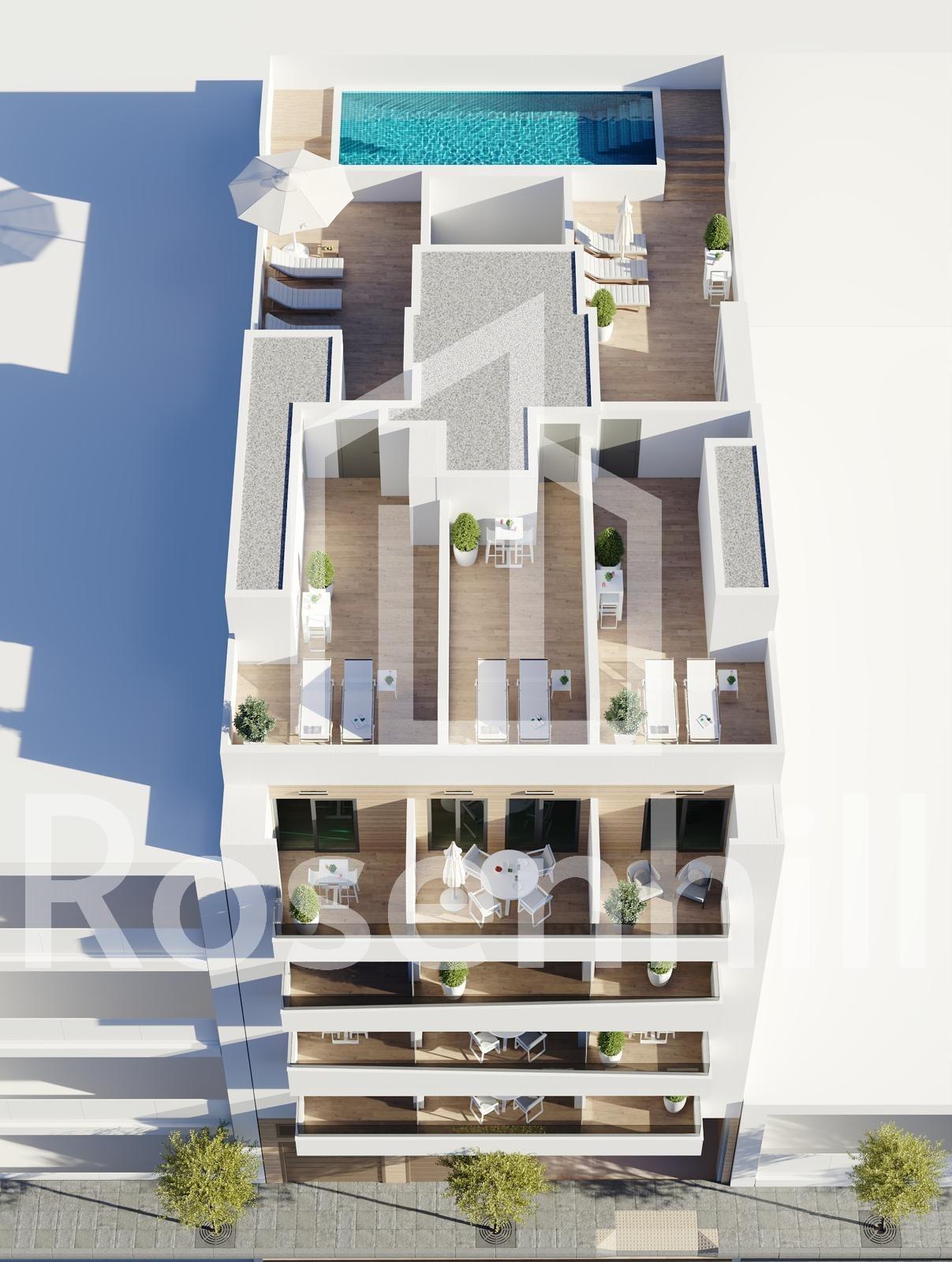 Newly built apartments in Torrevieja Just 600 metres from Playa del Cura beach Prime location in the heart of Torrevieja Discover these brand new apartments and penthouses in one of the most sought-after areas of Torrevieja, just 600 metres from Playa del Cura beach and 300 metres from the seafront promenade. Located in the city centre, this lively neighbourhood offers all essential amenities within walking distance, including supermarkets, shops, restaurants, cafés and public transport. Torrevieja is a well-known coastal town on the Costa Blanca, famous for its mild Mediterranean climate, lively atmosphere and year-round seaside lifestyle. Modern apartments with spacious layouts This exclusive new development consists of only 12 one- and three-bedroom apartments and penthouses, designed for comfort, functionality and contemporary style. The apartments on the middle floors feature spacious terraces, while the penthouses enjoy an additional private solarium, ideal for sunbathing or al fresco dining. All homes include an open-plan kitchen connected to the living-dining room, creating bright and welcoming interiors. The bedrooms have fitted wardrobes and the bathrooms are fully equipped with furniture, mirrors and shower screens. Optional parking spaces are available at an additional cost. Quality finishes and energy-efficient features The flats are built with high-quality materials and a strong focus on energy efficiency. The aluminium exterior joinery includes thermal break technology and double glazing for thermal and acoustic insulation. Motorised shutters add convenience and security. Each home has pre-installation for ducted air conditioning and heating, reinforced entrance doors and white lacquered interior doors. Hot water is produced by an aerothermal system, reducing energy consumption and improving sustainability. Roof terrace solarium with communal swimming pool Residents can enjoy an exclusive roof terrace solarium with communal swimming pool, accessible by lift or stairs. This private area is perfect for relaxing, sunbathing and enjoying panoramic views of the city. It offers a peaceful retreat above the bustling streets of Torrevieja and adds significant value to the development. Lifestyle and surroundings of Torrevieja Torrevieja is known for its extensive coastline, sandy beaches and iconic salt flats. The Lagunas de La Mata y Torrevieja Natural Park is located about 5 km away and offers hiking trails and unique landscapes. Several golf courses, such as Villamartin Golf and Las Colinas Golf, are between 12 and 18 km away. The marina and port of Torrevieja are approximately 1 km away. Alicante Airport is about 45 km away and Murcia International Airport is about 65 km away, both with excellent European connections. Your home on the coast awaits Don’t miss this opportunity to purchase a modern, newly built apartment near the beach in Torrevieja. Contact us today for more information or to arrange a private viewing.