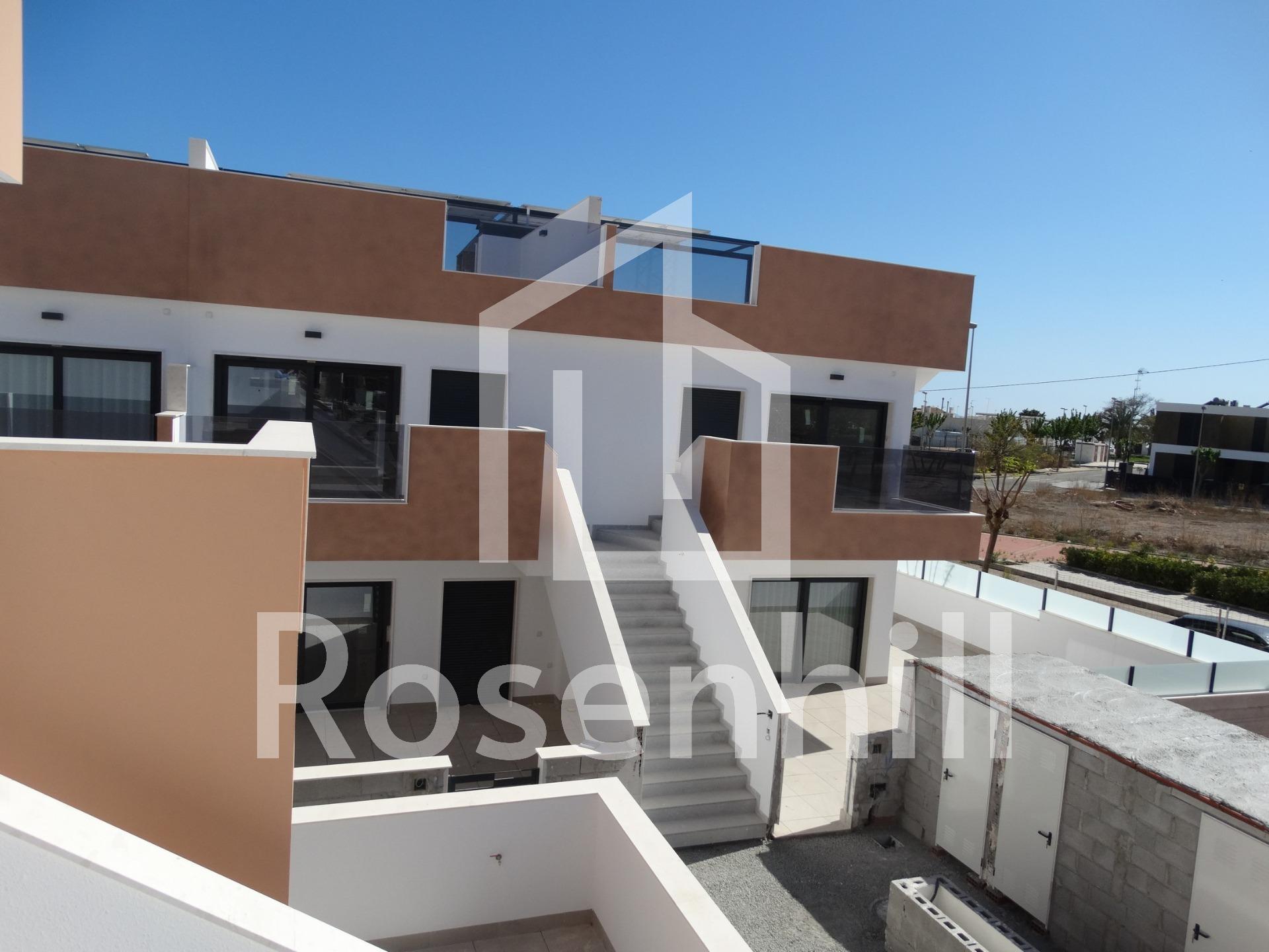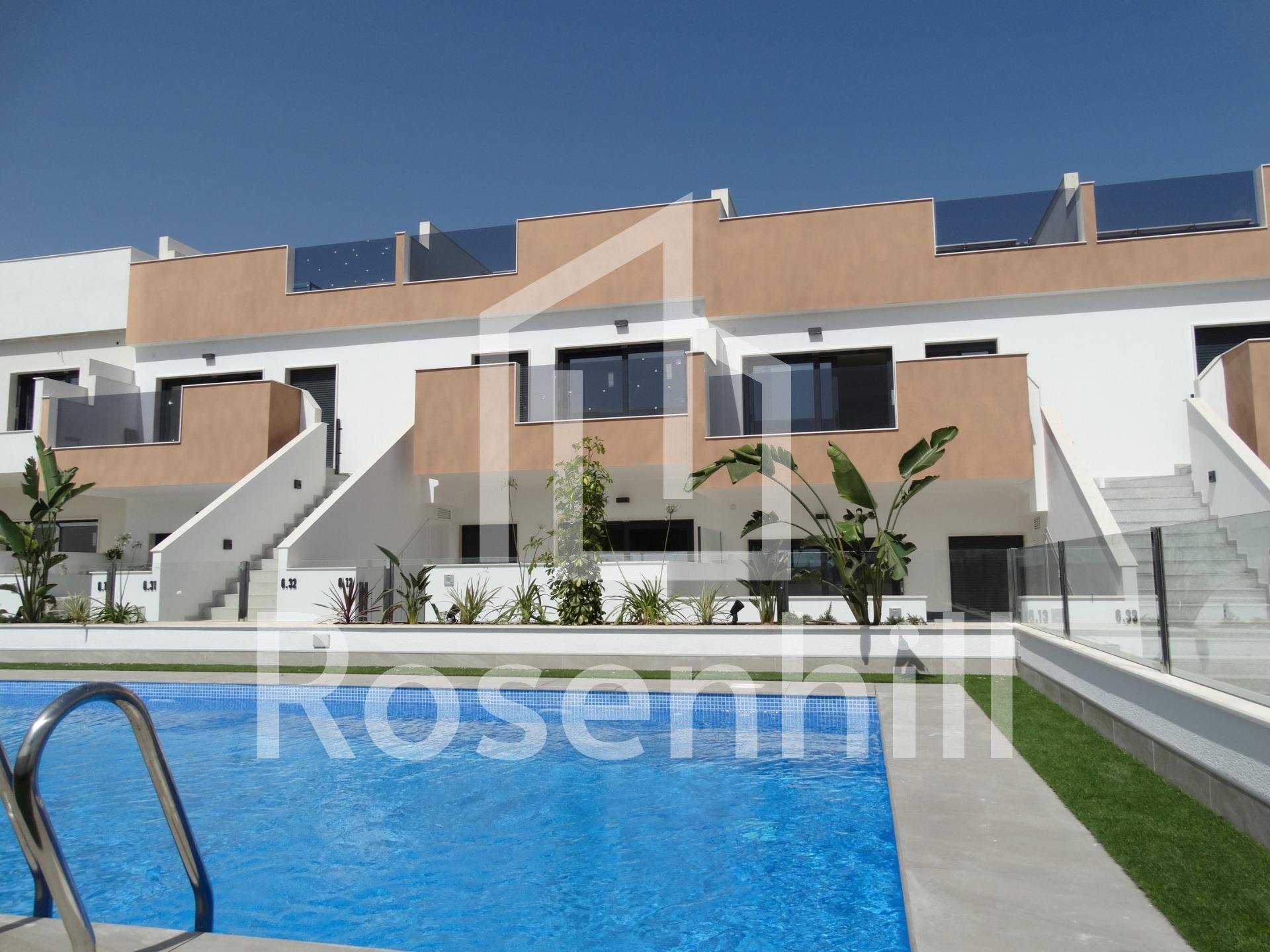 Newly Built Bungalows with Solarium or Garden in Pilar de la Horadada Modern Residential Development on the Southern Costa Blanca Located in the charming municipality of Pilar de la Horadada, this new residential development of bungalows offers a comfortable, Mediterranean lifestyle in one of the most attractive areas of the Costa Blanca. Pilar de la Horadada is known for its welcoming atmosphere, excellent climate and extensive sandy beaches such as Las Higuericas and Mil Palmeras, ideal for enjoying with the family or practising water sports. Layout and Types of Properties The complex consists of 28 modern bungalows available in 2 and 3 bedroom versions, distributed as follows: Ground floors with private garden Upper floors with private solarium and assigned storage room Many of the properties are south-facing, ensuring excellent natural light, and offer views of the communal pool or the adjacent park. Functional and well-equipped spaces Each property has been designed with spacious and functional spaces: Open-plan kitchen with large living-dining room Built-in wardrobes Private terrace in each unit Parking space included In addition, the properties feature: Hot water via aerothermal system Pre-installation of air conditioning PVC exterior carpentry with double glazing and aluminium shutters Bathroom furniture included Communal Areas and Natural Environment The residential complex includes a communal swimming pool surrounded by green areas, perfect for enjoying the sun and tranquillity. Just 4 km from Las Higuericas Beach, it can be easily reached on foot or by bike along the pleasant promenade that connects to the sea. Excellent location and connectivity The location of the residential complex allows access to all kinds of services and points of interest: Supermarkets, shops, bars and restaurants less than 1 km away Golf courses such as Lo Romero 6 km away Dos Mares shopping centre 11 km away Mil Palmeras and Torre de la Horadada beaches just 5 minutes away Murcia (Corvera) airport 40 km away Alicante Airport 65 km away Your New Life in the Sun This residential development in Pilar de la Horadada represents an excellent opportunity to enjoy Mediterranean living in a modern and well-located property. Contact us today for more information or to arrange a viewing and take the first step towards your new home on the Costa Blanca.
