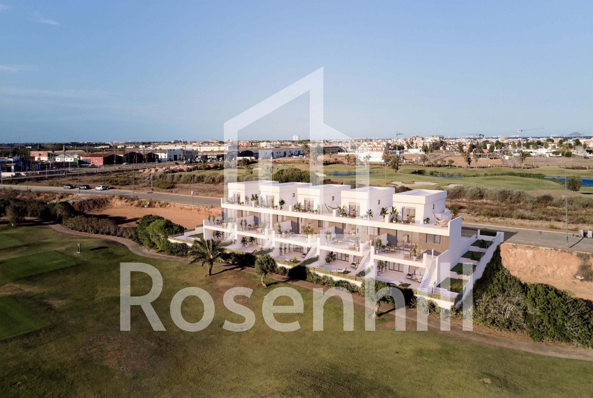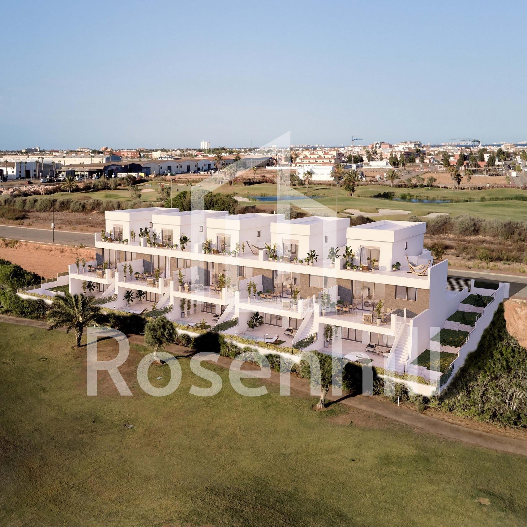 Newly built semi-detached and detached villas in La Serena Golf-Los Alcázares Discover your dream home in these stunning semi-detached and detached villas located on the front line of La Serena golf course in Los Alcázares, where modern living meets breathtaking golf views. These meticulously designed 3-bedroom, 4-bathroom homes are perfect for families seeking luxury, comfort and a touch of Mediterranean charm. Bedrooms and Bathrooms: Three spacious bedrooms, designed with comfort in mind. Each bedroom has built-in wardrobes, ensuring ample storage space. Four contemporary bathrooms with high-quality fittings and finishes. A cosy open-plan kitchen and living room, ideal for entertaining and family gatherings. Spacious living room with large windows that bathe the space in natural light and offer stunning views of the golf course. A generous basement that can be used as a recreation area, home gym, or additional storage. Dedicated parking space for secure parking and convenience. Private swimming pool surrounded by a beautiful garden, perfect for relaxing and enjoying the sun. Large terrace for al fresco dining and entertaining, with picturesque views of the golf course. Air conditioning and heating installed for year-round comfort. Proximity to local amenities, including shops, restaurants and, of course, world-class golf courses. Los Alcázares is known for its beautiful beaches, vibrant community, and a wealth of outdoor activities. The location offers a perfect balance of tranquillity and accessibility, making it an ideal place for both tourists and year-round residents. This property is a perfect blend of modern architecture, comfort and leisure. Don’t miss the opportunity to own a piece of paradise in Los Alcázares!