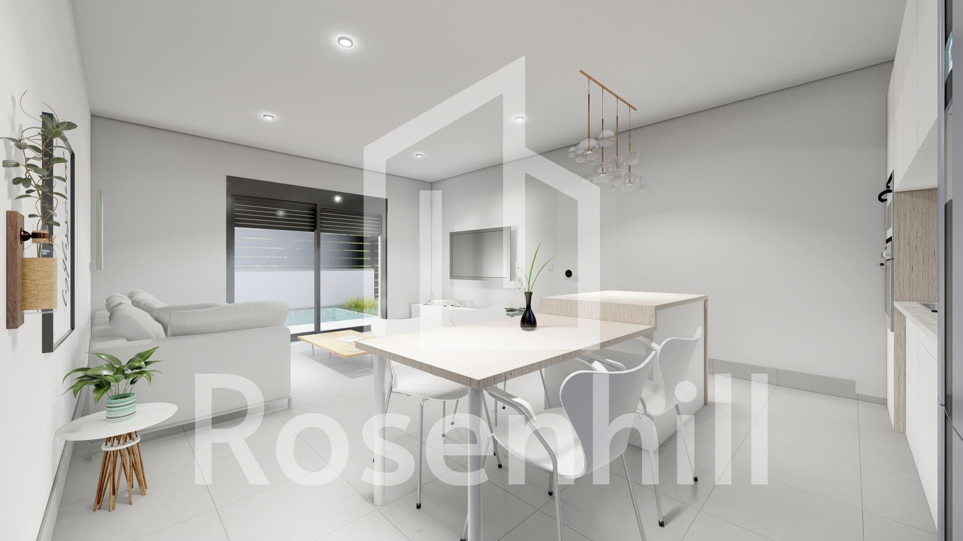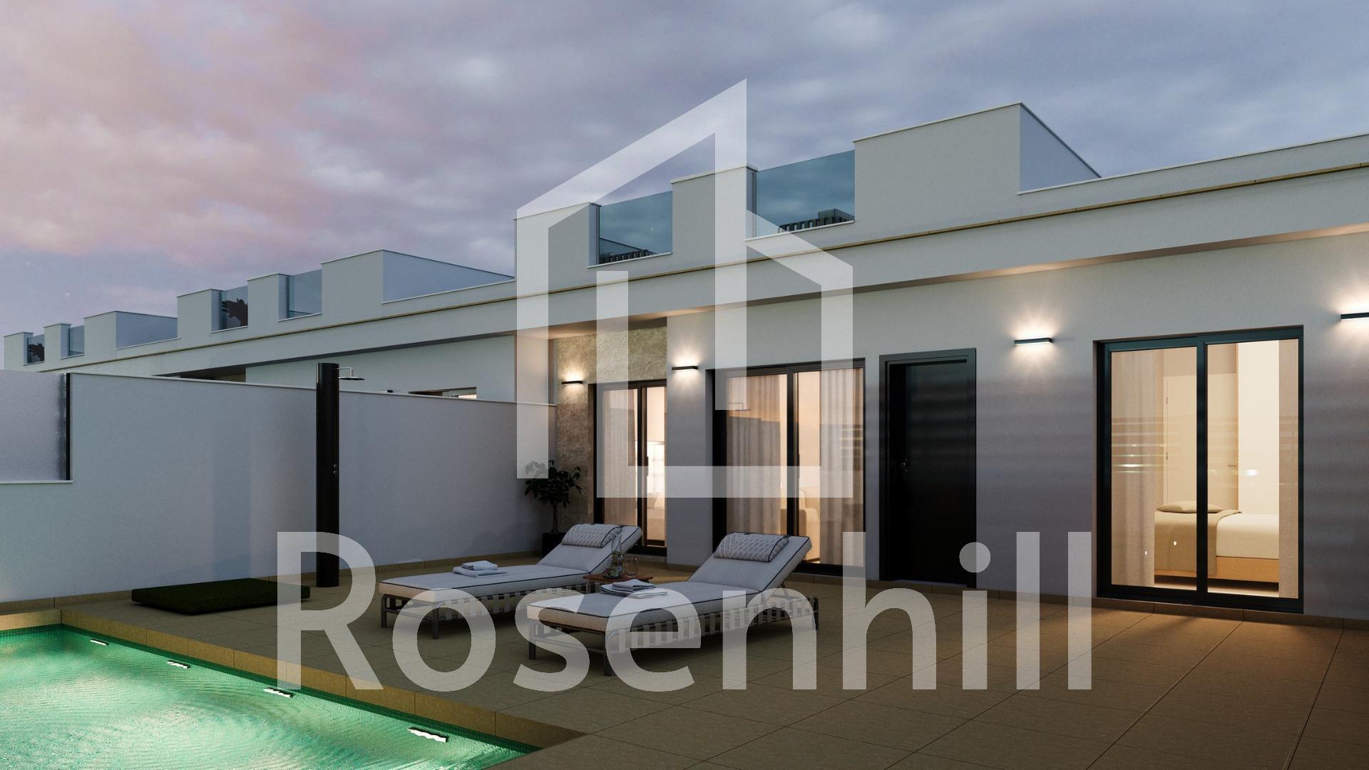 Semi-detached and Semi-detached Villas in Roldán, Murcia, Spain Modern Single Storey Villas with Solarium and Private Pool Discover this exclusive development of single-storey semi-detached and terraced villas in Roldán (Murcia), designed for comfort, style and energy efficiency. With options of 2 or 3 bedrooms and 2 bathrooms, each property has a private solarium, swimming pool and parking on the plot, ideal for enjoying the Mediterranean climate all year round. Located in a gated complex with security control, this development guarantees privacy and tranquillity, whilst being close to all essential services, parks, sports facilities and prestigious golf courses. High Quality Features and Functional Design Each villa has been built with top quality materials to offer a modern and comfortable home: PVC exterior carpentry with thermal break and double glazing. Fully fitted kitchen with large capacity units and white goods included. Elegant bathrooms with suspended furniture, mirror with LED lighting and shower screens. Security entrance door for peace of mind. Pre-installation for ducted air conditioning. 3 photovoltaic solar panels (1.5 kW) for greater energy efficiency. Summer kitchen on the solarium with sink and fridge socket. Strategic Location in Roldan, Murcia Roldán is a charming traditional village with a privileged location in the Region of Murcia. It has all essential amenities such as supermarkets, restaurants, bars, health clinics, pharmacies, petrol stations and more. Furthermore, this development is just minutes away from some of the best golf courses in the area, such as La Torre Golf and Terrazas Golf, offering a unique experience for golf lovers. Distances to key points of interest: Murcia-Corvera Airport – 15 km (15 minutes by car). Mar Menor Beaches – 15 km (20 minutes by car). La Torre and Terrazas golf courses – Less than 5 km. Murcia City Centre – 30 km (30 minutes by car). A Perfect Mediterranean Home Whether as a permanent residence, holiday home or investment property, these villas in Roldan offer the perfect combination of modern design, prime location and quality of life. Contact us today for more information or to arrange a viewing of your future home in Roldan.