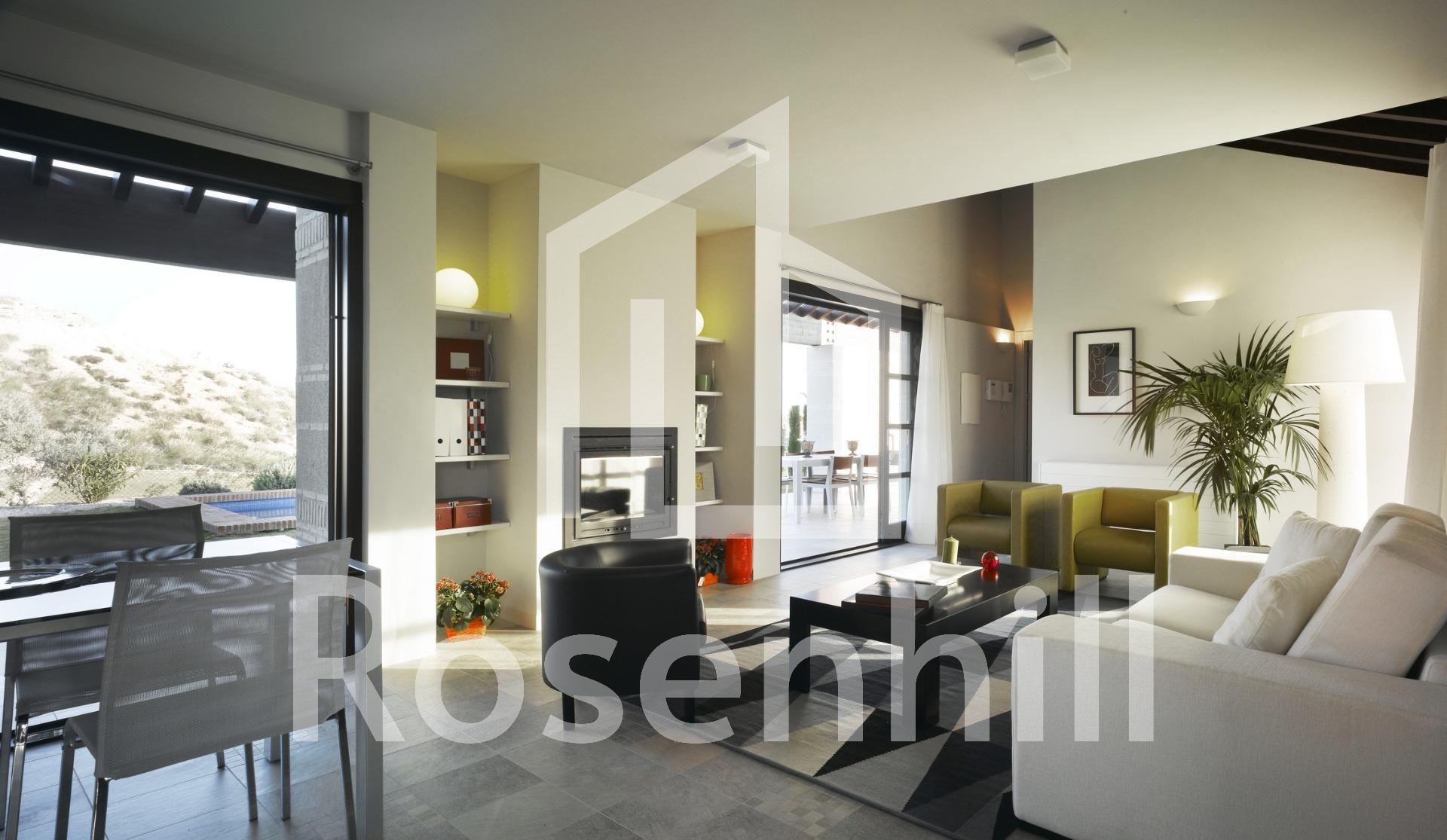 Some units have a rooftop solarium. Located in the prestigious Peraleja Golf Resort, in the Murcia region of southern Spain. These modern Mediterranean homes are set on spacious plots, each with a private pool, garden and parking. Designed with sloping roofs and natural materials such as wood and stone, these homes blend seamlessly into the surrounding landscape, while offering elegant and timeless interiors. Comfortable living with top-quality finishes Each house features: